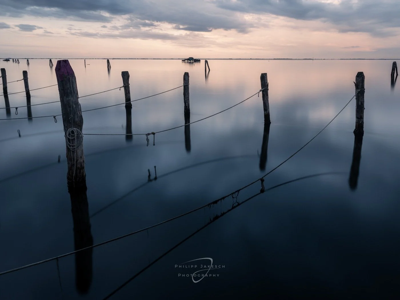 Eines Morgens fahren wir mit dem Vaporetto hinaus in Richtung Lido. Diese langgezongenen Sandbänke stellen eine Brücke zwischen der Lagune von Venedig und dem offenen Meer dar. Die eine Seite ist großteils Sandstrand, die andere Seite ist bewohnt und man findet hier sympatische Fischerhütten und tolle Motive. Durch die lange Belichtung abstrahieren wir diese Motive noch weiter.